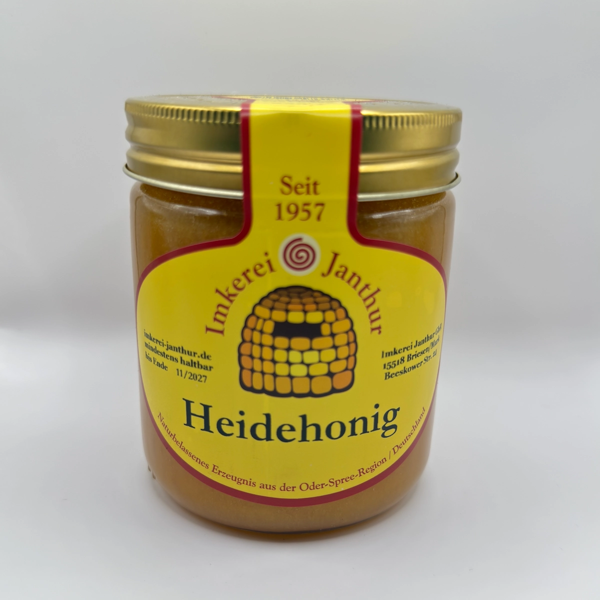 Heidehonig ist einer der kostbarsten Honige Europas. Er entsteht aus dem Nektar der Heideblüte und besitzt eine charakteristische geleeartige Konsistenz, die ihn deutlich von anderen Sorten unterscheidet.