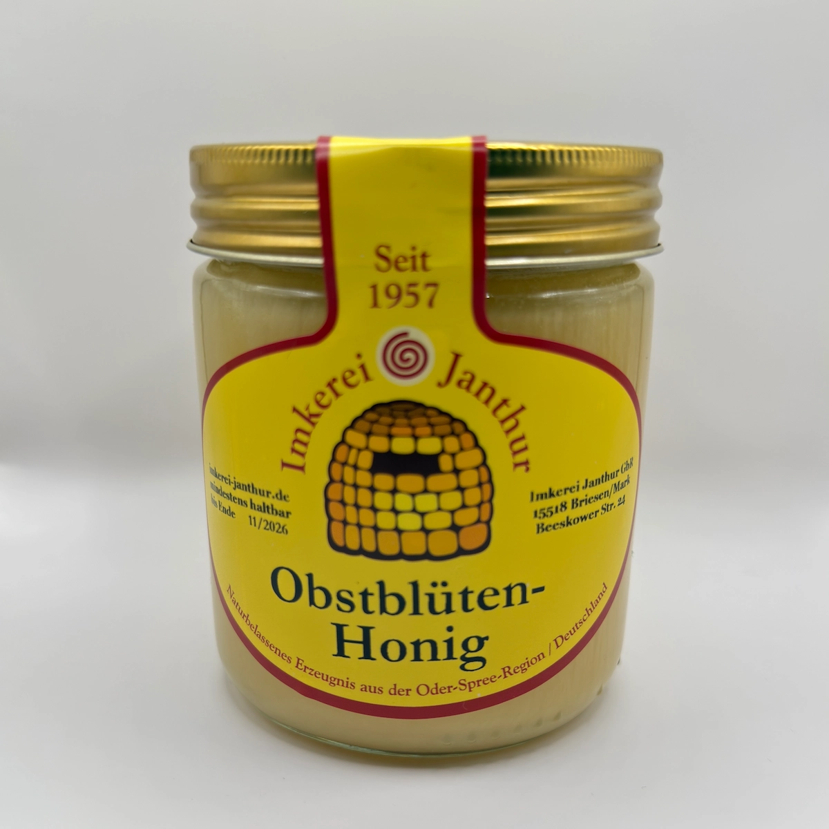 Obstblütenhonig entsteht aus dem Nektar von Apfel-, Kirsch-, Birnen- und Pflaumenblüten. Er ist ein klassischer Frühlingshonig mit feinem Duft und frischem, fruchtbetontem Geschmack.