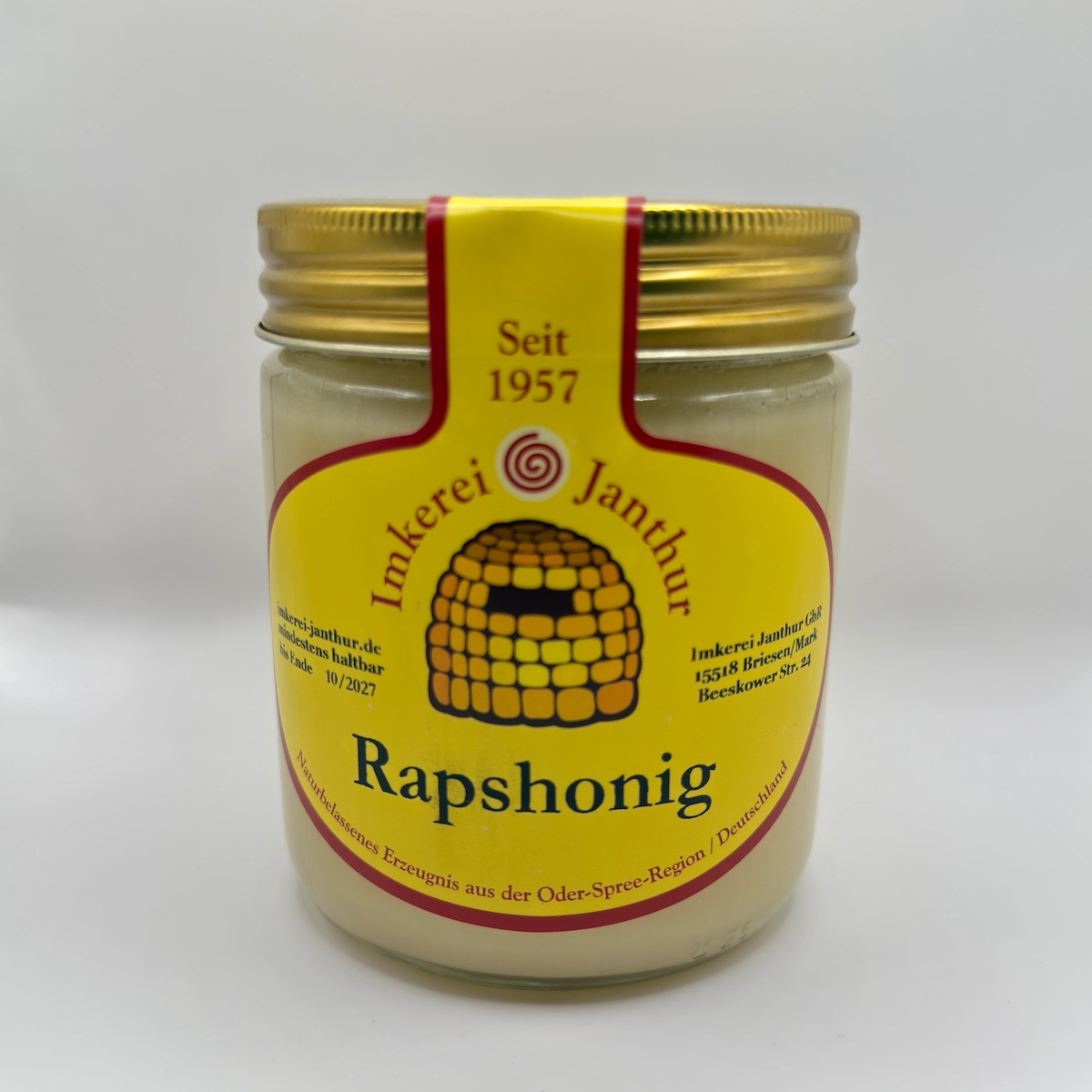 Glas cremiger Rapshonig der Imkerei Janthur, frontal fotografiert