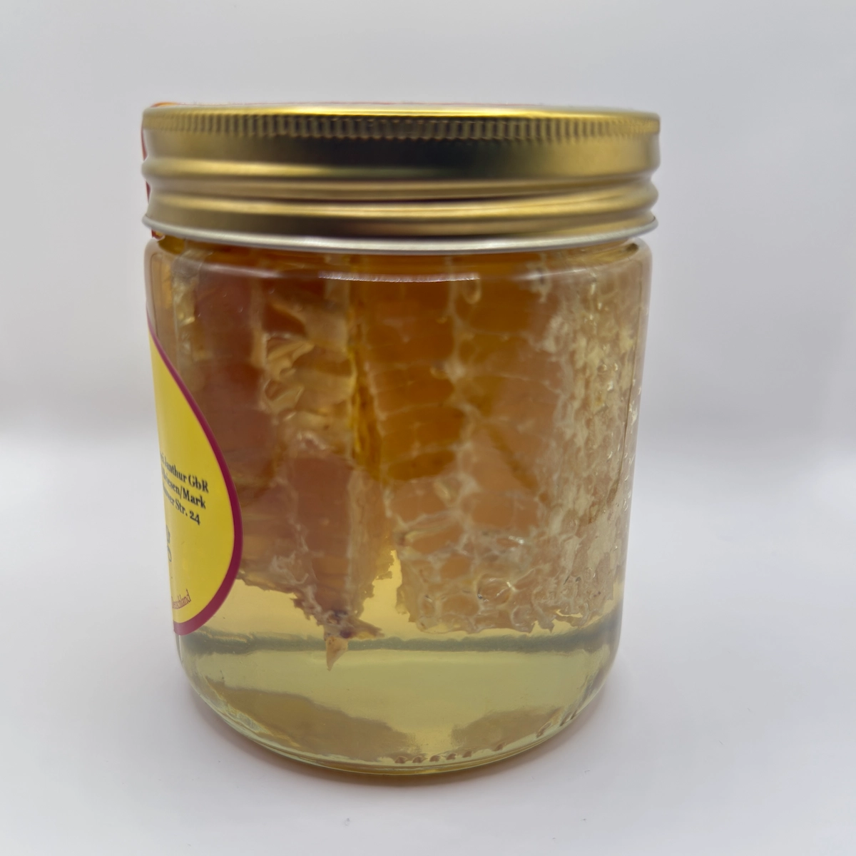 Das essbare Wabenstück gilt als eine der ursprünglichsten Formen von Honig. Es enthält neben Honig auch feines Wachs, Pollenreste und ätherische Öle der Pflanzen – ein unverfälschtes Naturerlebnis.