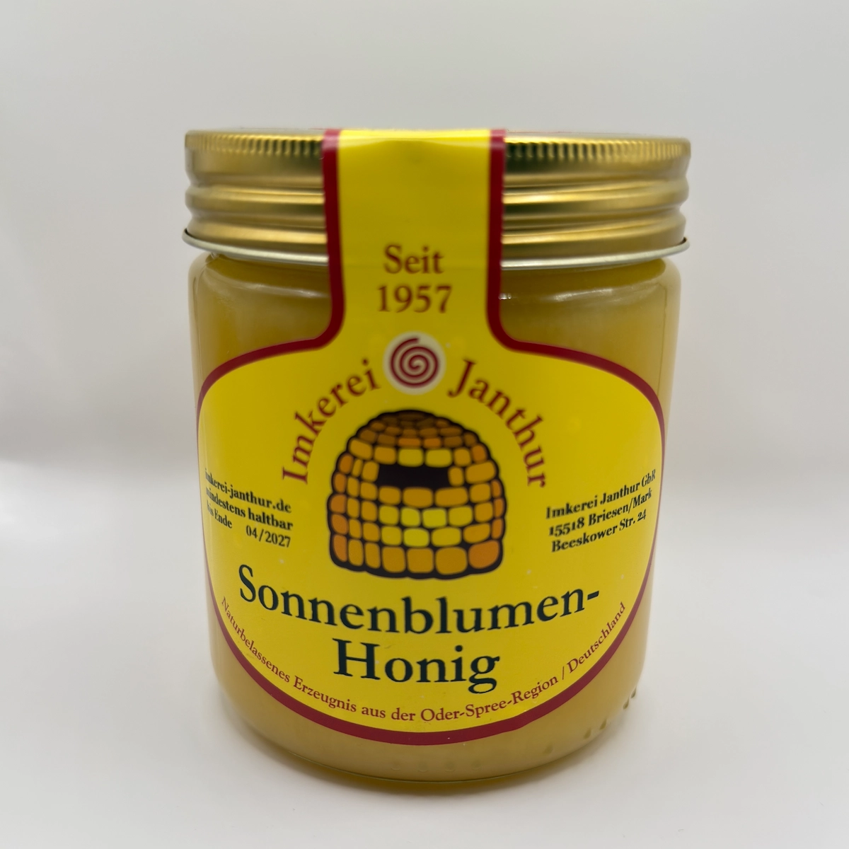 Glas Sonnenblumenhonig der Imkerei Janthur vor weißem Hintergrund